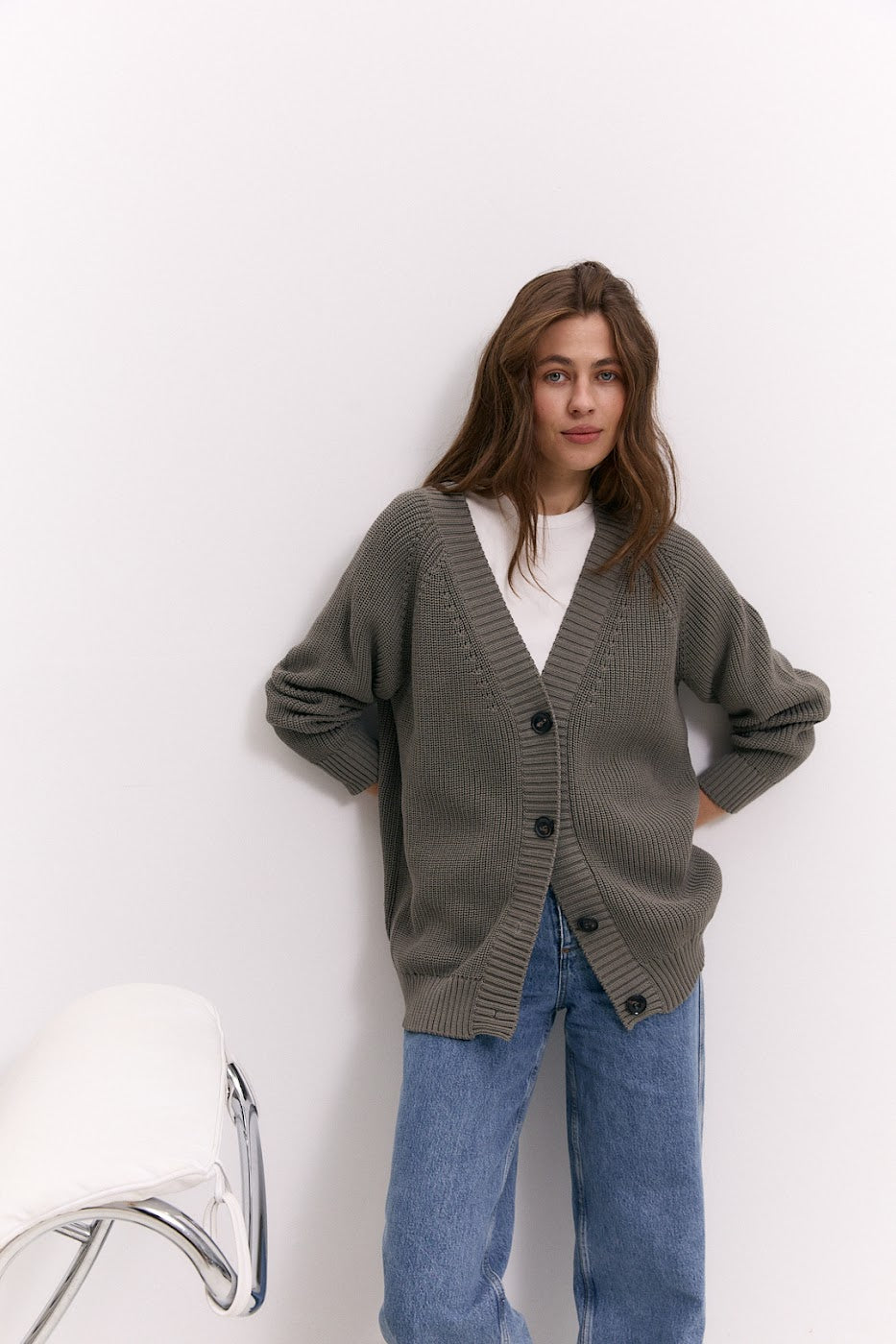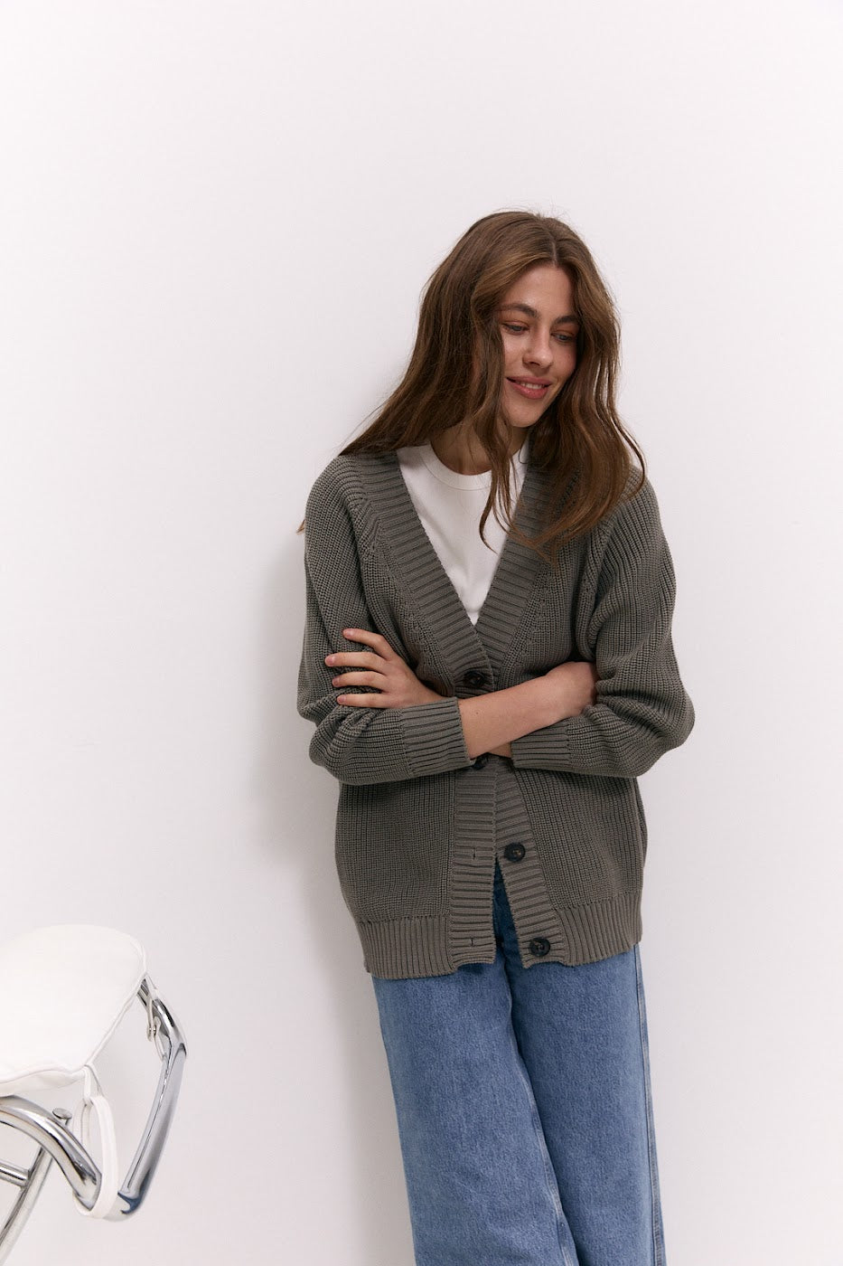 Long-sleeved cardigan in cotton and cashmere with v-neckline and horn button closures.