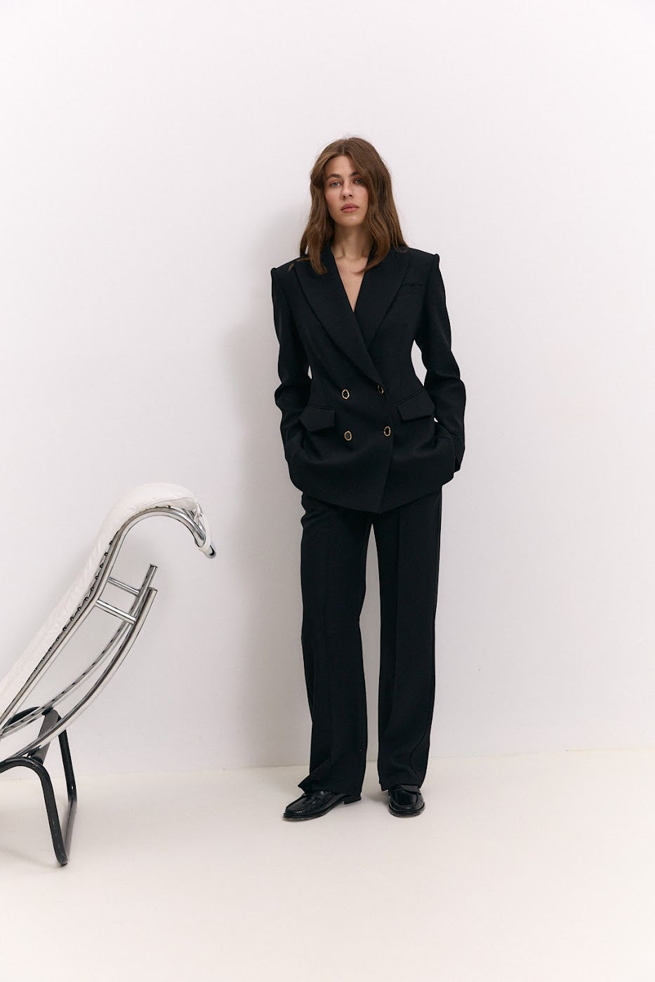 Double-breasted jacket in virgin wool with notched lapels, front chest and besom pockets.